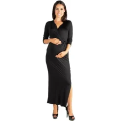 Designed with a faux wrap silhouette, this ¾ sleeve maternity maxi dress features a V-neck, a gathered waist for a feminine silhouette, and a sexy above the knee side slit. Available in TURQ and burgundy.