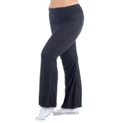 These soon to be your new favorite fitness pants create a flattering silhouette with a wide foldover waistband, snug fit through the hips and thighs, and bell bottom flare toward the hem. Made from a comfortable stretch material these black flared plus size yoga pants take you from workout to relaxing with ease.