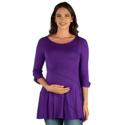 A perfect piece for any season, this flattering maternity tunic offers both comfort and style. This stylish women’s tunic top is versatile enough for everyday wear. Features ruched ¾ sleeves, merrow stitch details along the front, loose flare style, and beautiful boat neckline.