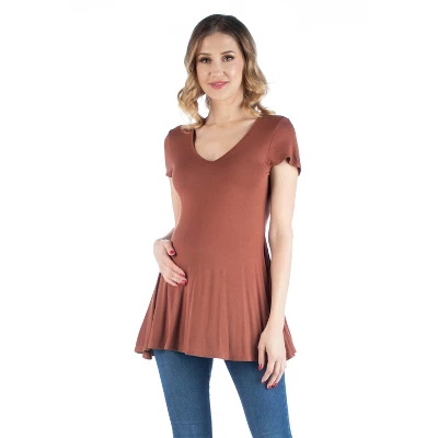 This simple yet chic maternity top features a flared hemline paired with a slim fit waist design that offers a comfortable fit for all silhouettes. Its a trendy and classy must have piece featuring an elegant v neck and flattering length. This comfortable top is designed with a relaxed loose fit, extended length, and a figure flattering flared shape. With its short sleeves and v neck, this fashionable Tshirt is easy to style. Pair it with jeans and flats for a cute yet comfortable look. Made in the USA from a comfortable stretch material. Rayon Spandex Knit.