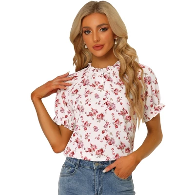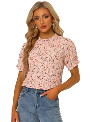 - Ruffle Mock Neck, front Button Loop, Floral Print, Ruffled Short Sleeves with Elastic Cuff