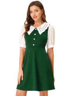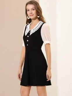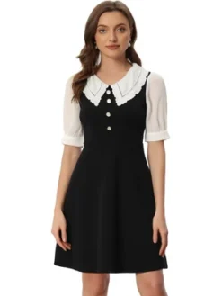 - This fit and flare dress cut boasts an adorable color-blocked chiffon on the short sleeves and pointed collar in a delightful white lacework decor