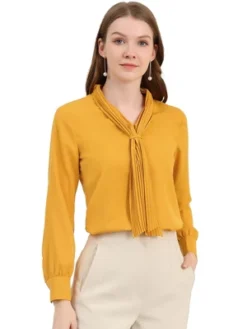 - Elegant Style, Long Sleeve, Pleated Tie Neck