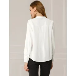 This solid color shirt comes with a classic design that is a staple in any office wardrobe. The delicate slightly striped texture becomes a standout detail on the classic silhouette of this white button-down, featuring a stand collar and long sleeve. This spring long sleeve shirts feature a subtle striped texture, long sleeves with button cuffs, and stand collar. The button-down shirt gets an elegant, office vibe update with a classic stand collar and straight silhouette. Pleats at the shoulders enhance the look and fit of this shirt, styled with a button closure and button cuffs. For women, slacks or skirts with this blouse with a suitable jacket constitute business casual.