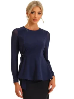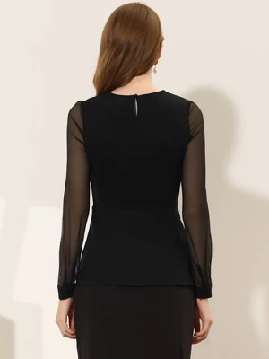 Everyday dress in an elegant contrast mesh peplum top. A peplum top with a ruffle hem and sheer long sleeves offers a charming look for day or night. Perfectly pair it with midi skirts and jeans for a beauty and fashion look. Suitable for casual, work, office, meeting, and daily wear. Get your shimmer on in this chic yet simply styled mesh peplum top. There’s nothing like a touch of mesh to elevate your style, and this top also features a sheer sleeve and a ruffle hem for a put-together look. This blouse is perfect for being paired with everything high-rise in your closet.