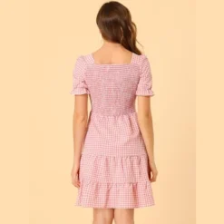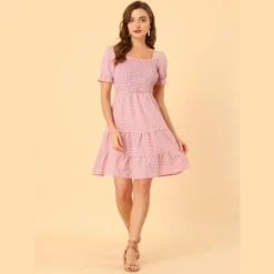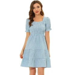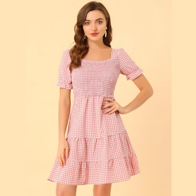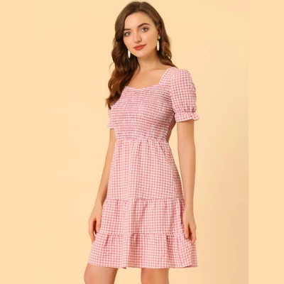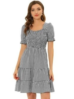 - Dreamy gingham and ruffled hem bring casual romance to a puff-sleeve dress. Perfect style with high heels for a cute look
