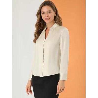 - Satin, Ruffled Stand Collar, V Neck