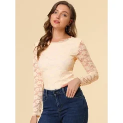 Amp up your ensemble’s feminine appeal with this all-over floral lace top. This lace top features a scalloped round neck, sheer long sleeves, and a slim silhouette. It is suitable for working, parties, shopping, and many occasions. Slight stretch fabric creates a breezy, textural base for this lace top, which is accented with a puff sleeve for a feminine dimension.