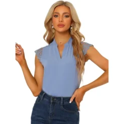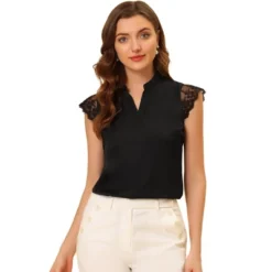 - This top is made up of several design points: Lace Cap Sleeve, Stand Collar with V Neck, Workwear Style
