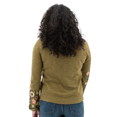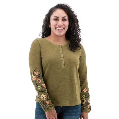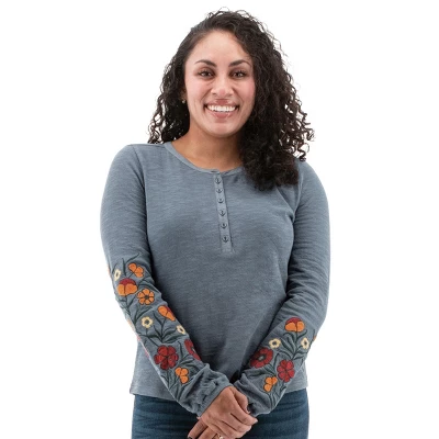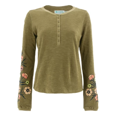 Lightweight and ethically produced, the Juliana Henley is a showstopper. This top is produced at a Fair Trade Certified™ factory with the sustainability of 100% organic cotton. Organic cotton grants the earth a break and is a wonder against the skin. The stand-out feature of this top is the bold color-contrast, asymmetrical embroidery along the arms, but we bet you’ll also love the stretch and structure of this top that is both flattering and comfortable all day long. A textured slub double knit accessorizes the outer while a jersey back sits flat and smooth against the skin. The details polish the Juliana Henley, including poplin trim around neck and placket, fabric matched buttons, and a gathered, elastic cuff.