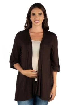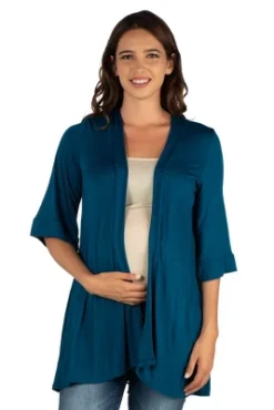 An easy add on to any look, this elbow length sleeve maternity cardigan for women is a great wardrobe staple. Featuring loose fit elbow length sleeves, open front design, and extend length, and a comfortable relaxed fit. Simply throw this cardigan on over a tshirt and jeans look for an added touch of style. Available in eight classic colors and made from a comfortable stretch material that is machine washable.
