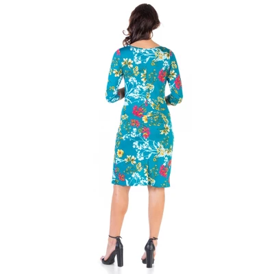 A chic and comfortable maternity dress that is ready for a Sunday brunch or an eyecatching wedding guest look. This beautiful teal floral print dress features a tasteful round neckline, elbow length sleeves, and a figure flattering rouched detail down the front. Far from basic, the tulip style skirt with its overlapping layers ads a beautiful and sophisticated touch. Pair with sandals for a casual day look or make it an evening look with heels. Made from a comfortable stretch material in a polyester spandex blend.