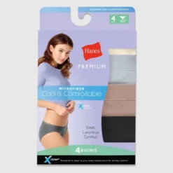Indulge your every day in the Hanes Premium™ Women’s Microfiber with X-Temp® Bikinis. The luxuriously sleek microfiber fabric moves with you for all day comfort. And the no-ride-up leg bands stay-in-place—guaranteed. The X-TempTM technology adapts to your body temperature for all day comfort. Other comfort features include a tag-free label and smooth, fabric covered waistband. The bikini cut features narrow sides and a low-rise waist. Available in a convenient, assorted 4-pack, these Hanes Premium™ Women’s Microfiber with X-Temp® Bikinis turn luxurious comfort into an everyday delight.