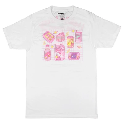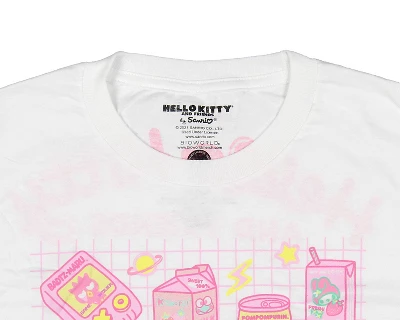 Hello Kitty is known for her kind heart and her love of baking cookies. She loves her mom’s apple pie and loves to collect things. She is known and recognized by her red bow. Kitty White’s character was created in 1974, the Hello Kitty media franchise has grown to include clothing, accessories, toys, games, books, manga, anime series, and music albums, along with other various product lines and media productions. This white tee features a front mostly pink grid design of snacks and games. This top is made of 100% Cotton and is tagless for added comfort. Listed in Junior sizes.