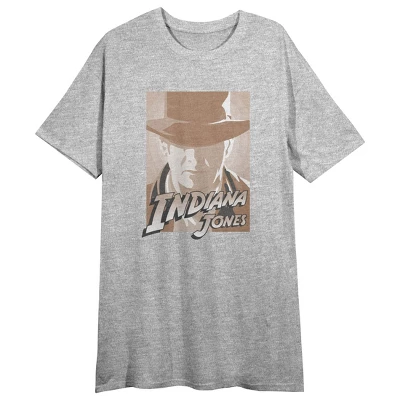 Join Indy on his adventures with this Indiana Jones and the Dial of Destiny night shirt. The shirt features poster art of Indiana Jones above white letters that spell out his name. The tee comes in a heather gray short sleeve crew neck. Indiana Jones and the Dial of Destiny fans will love this comfy night shirt.