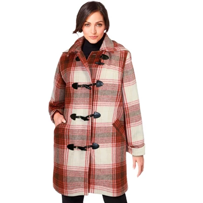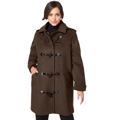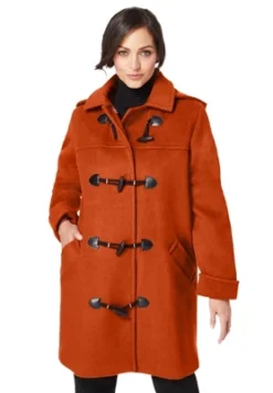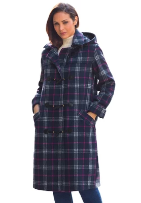 Keep your look chic and cozy in our plus size women’s coat with classic wood and faux-leather toggle front close. Side pockets and roll cuffs. Versatile button-off hood.