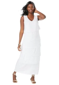 Elegant, long tiered dress with diagonal layers across the front bodice. V-neckline and wide straps. Smooth back.