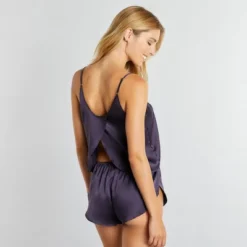 A simple but stunning sleepwear silk cami. The Journelle Celine Open Back Cami is perfect to lounge at home, or pair with jeans to wear out. The layered back allows for movement, showing off a subtle and seductive open back. Slightly cropped cut to perfectly skim the matching Journelle Celine Tulip Shortie.
