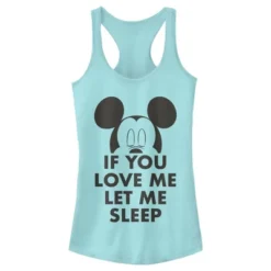 - Strut your stuff with this stylish new everyday juniors’ racerback tank top that is perfect for every occasion! Featuring Mickey Mouse with his eyes closed and the phrase: “If You Love Me Let Me Sleep,” across the front.