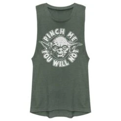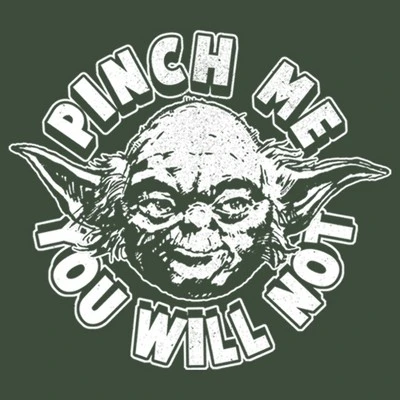 - This retro design features Yoda encircled by the words “Pinch Me You Will Not”