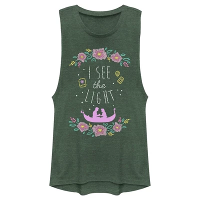 - Strut your stuff with this stylish new everyday Juniors’ Festival Muscle Tank Top that is perfect for every occasion! Featuring a silhouette of Rapunzel and Flynn Rider on a boat with the text “I See the Light” written above them, encircled by pretty flowers.