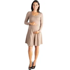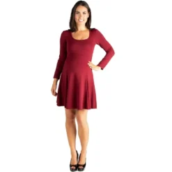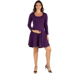This fit and flare maternity dress has it all, a lovely scoop neckline paired with fitted long sleeves alongside a figure flattering design. The fitted top portion and classic colors draw the eye while the knee length skater skirt creates a polished yet fun look!