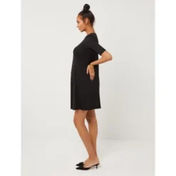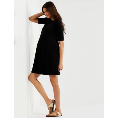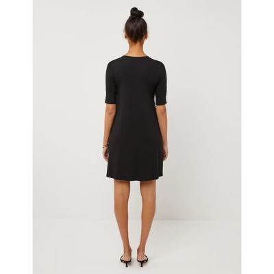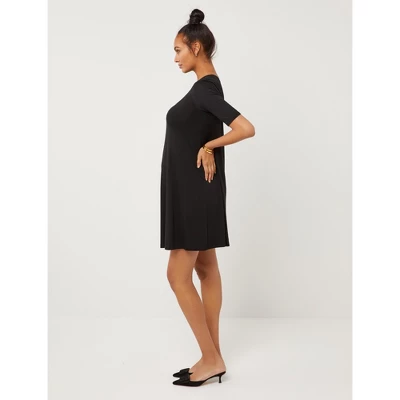 Every closet needs a classic A-line dress. This staple style hits above the knee and is made in a slinky jersey knit for movement and comfort. The 3/4 length sleeves are a trendy touch on a dress you can style for any season from pre to post. Wear on its own or accessorize and layer for a fresh look.