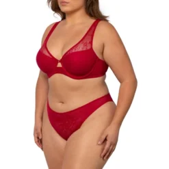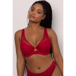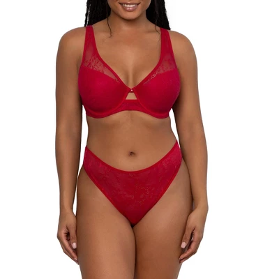 - Demi cups are cut for medium coverage, draped with a sheer mesh overlay, and outlined with matte, elastic trim to create a plunging neckline and comfortably wide straps.