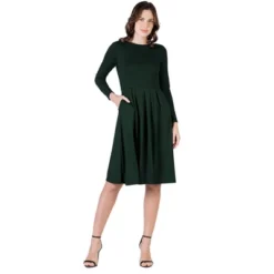 A fall wardrobe must have. This midi dress for women is great for any occasion whether casual or dressy. Featuring a round neckline, long sleeves, midi length hemline, pleated waist, and pockets for a finishing touch. Pair this fit n flare dress with ballet flat for a casual look or create a dressy look with heels. Available in nine beautiful color options, youll want one in every color. Made from a soft and comfortable stretch material that is machine washable for easy care.