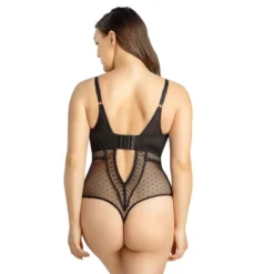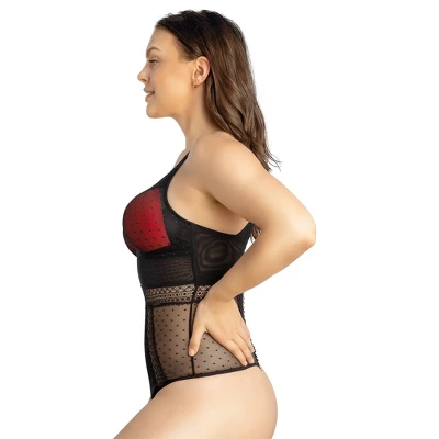The perfect bodysuit for every body! Our Mia Dot bodysuit has wire-free, mesh dot lace cups with removable and reversible padding. The ultra-flattering V-shaped back and thong back ensure no visible panty lines. This bodysuit has stretch lace trip at waist and panty. Perfect to wear alone with pant and skirt or underneath clothing. It’s a very trendy and alluring bodysuit that designed with extra support for fuller bust.