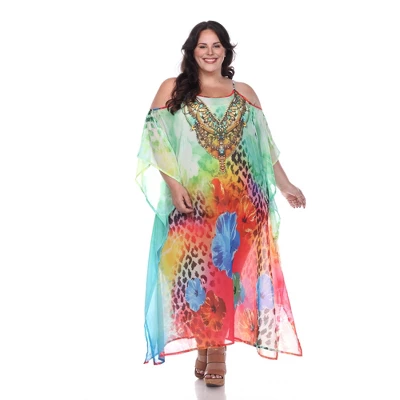 A rich multi print sprinkled with sparkle trims of this flowing Long Caftan tunic/top from White Mark, perfectly accenting this lovely sheer fabric. Features: material is Poly Georgette, bell sleeves, style is perfect for when on vacation, resort, a day at the beach, summer, brunch with friends, cover-up, long caftan.