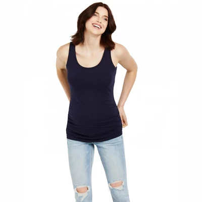 This basic sleeveless maternity tank top is a wardrobe must-have. Perfect for layering, this scoop neck tank is available in a variety of colors with just the right amount of length and stretch. Side ruching grows with the bump.