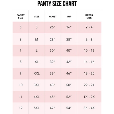| Panty Size | Size | Waist | Hip | Dress Size |