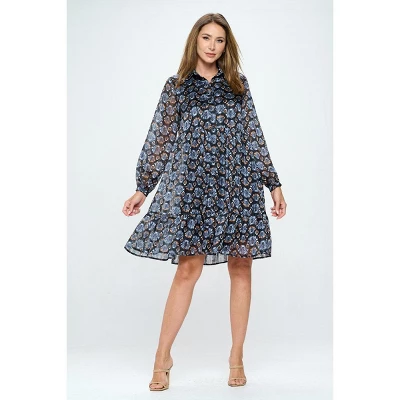 This elegant chiffon long sleeve dress is perfect for work or play. Sheer long sleeves with wide cuffs and collard neckline give this dress polish. The chiffon material continues through the body giving this dress movement while the lining offers complete coverage.The skirt has a wide ruffle hem and hits just above the knee. Pair with black opaque tights and heels for a night out or swap in flats and a blue or black blazer for a chic work look.