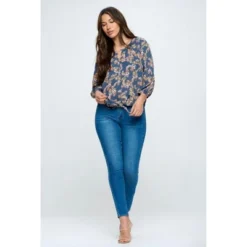 This three-quarter sleeve printed blouse is also one our favorite go-to items! It has a keyhole detail and a tie front knot at the waist. We love this look when paired back to denim as a perfect everyday top. Imported. Material – 100% Polyester Machine washable.