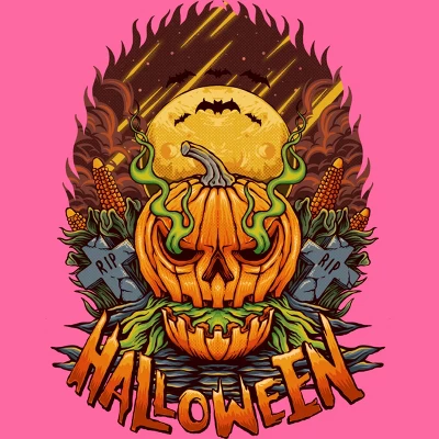 - This frightening Halloween design features a monster pumpkin crawling out of a grave in a cornfield on a smokey full moon night while bats fly overhead.