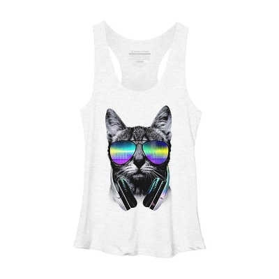 - This feline good design features a DJ tabby cat wearing headphones and cool sunglasses reflecting colorful music beats.