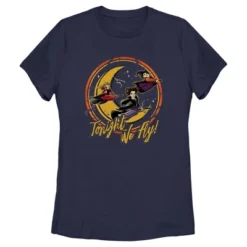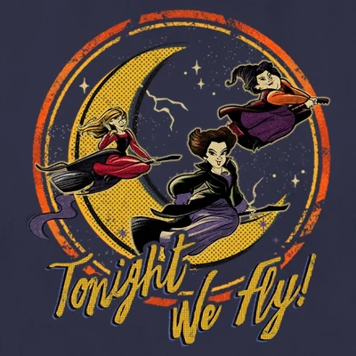 If you’re looking for a little hocus pocus this Halloween, then look no further than this officially licensed Disney Hocus Pocus Tonight We Fly Moon Women’s Graphic T-Shirt. You can light the Black Flame candle to awaken the Sanderson witches this Halloween, or you could just celebrate the holiday with this festive Hocus Pocus style instead! The witches Sarah, Winifred, and Mary are featured in a fun cartoon style as they fly across this Halloween tee on their brooms!