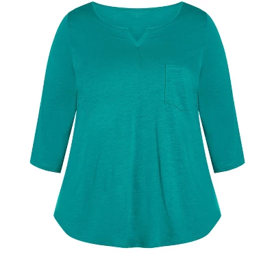 Revitalize your wardrobe staples with the jade Notch Neck Plain Tee. All eyes will be on you with its notched V-neckline, 3/4 sleeves and curve-loving relaxed fit. Everyday style made easy, Avenue is your one-stop-shop for plus size fashion. Inspired by a comfort-meets-style approach, this effortless brand marries relaxed silhouettes with dynamic prints and colors. From casual daywear to staple denim, Avenue has simplified your everyday dressing. Take your day-to-day look to new heights with comfortable basics or eye-catchingly printed pieces, all designed to keep you comfortable while flaunting your curves to perfection. Avalable in sizes 14 – 40.