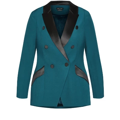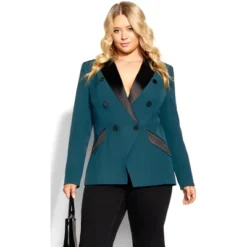 Take your wardrobe to the next level with the Tuxe Luxe Jacket! A statement piece in a beautiful and eye-catching jade shade, this luxurious double breasted jacket features something special at every turn. With satin accents, slightly padded shoulders, and buttoned cuffs, you’re sure to stand out in any room. The fully lined design lends a sophisticated look and feel making it perfect for airy summer days or cold winter nights. Bold and fiercely fashionable, no one does plus size fashion like City Chic. Loved around the globe for its diverse range of fashion-forward styles for any occasion. From show-stopping evening gowns to workwear and casualwear, City Chic will take your style to bold new heights. Available in sizes 14-32.