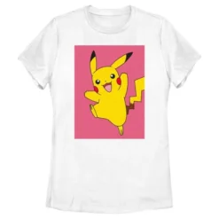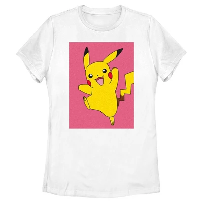 - Strut your stuff with this stylish new every day women’s t-shirt that is perfect for every occasion! Featuring a happy Pikachu leaping with a pink box background.