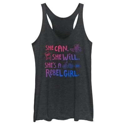 - Strut your stuff with this stylish new everyday women’s racerback tank top that is perfect for every occasion! Featuring gradient text that says “She Can. She Will. She’s A Rebel Girl.” printed across the front.